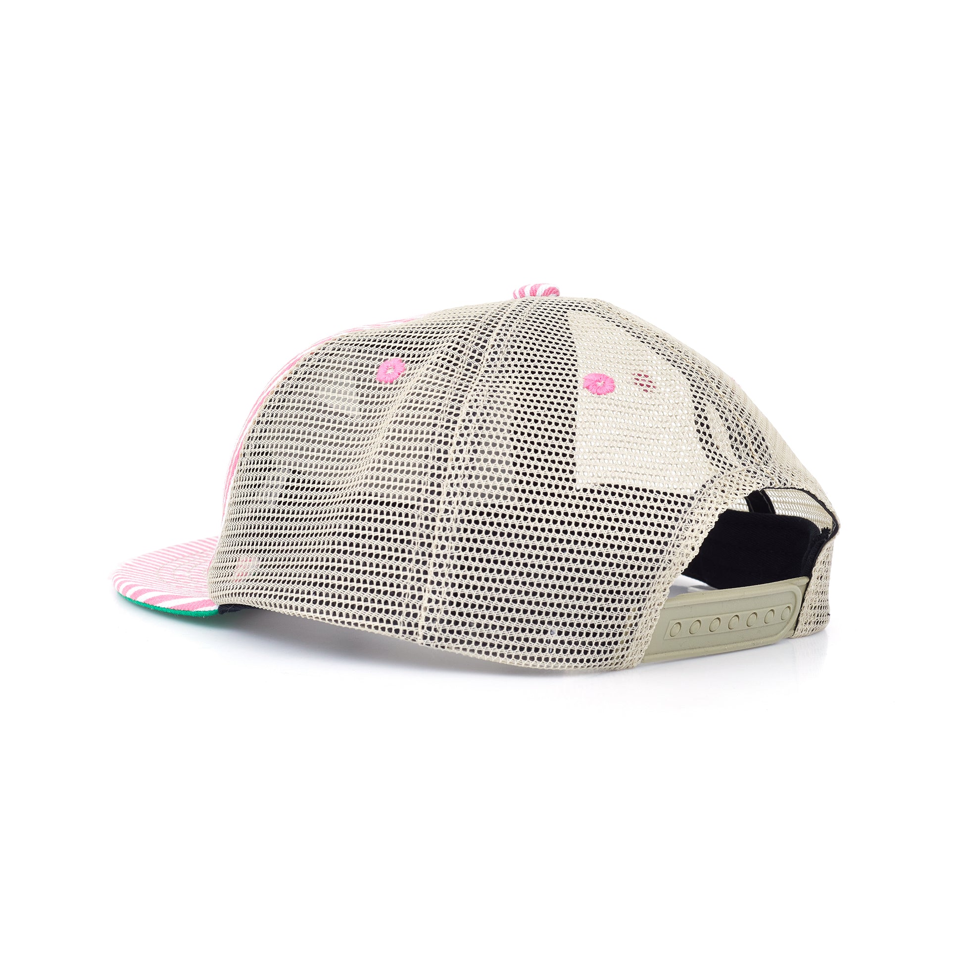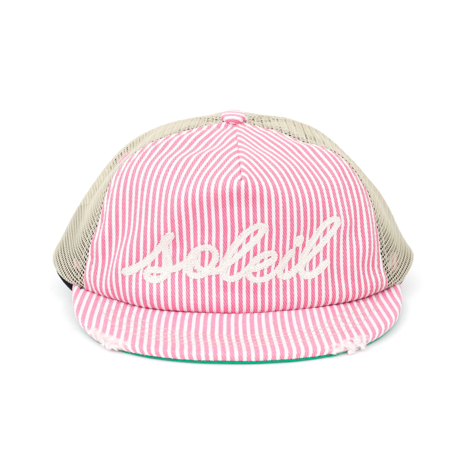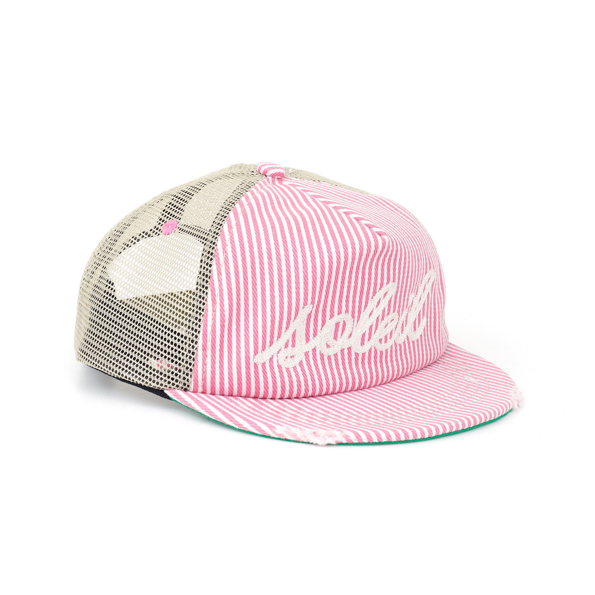 Nossa tradicional modelagem, confeccionado em sarja listrada fuscia, rede e estampa frontal bordado.